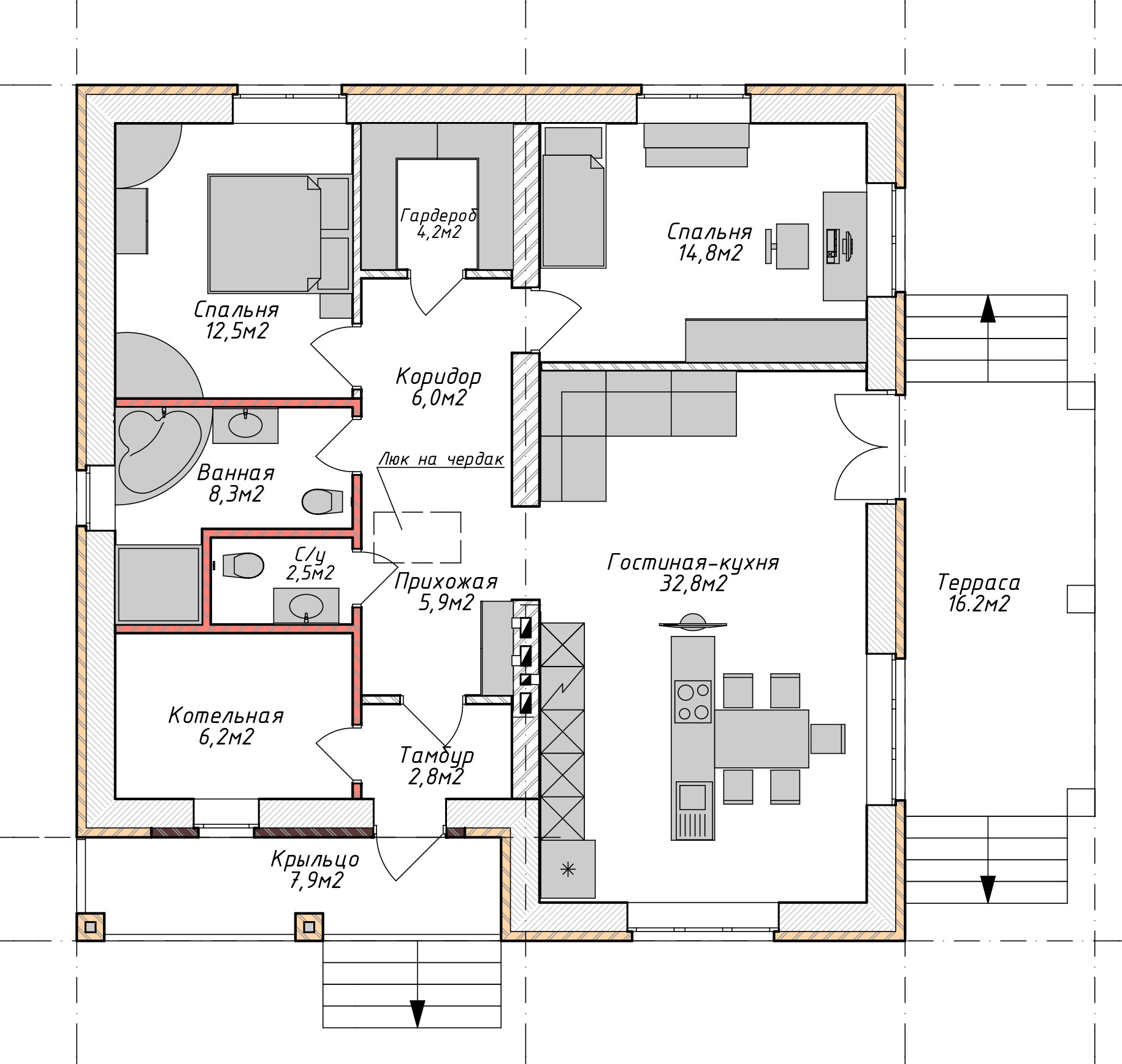 "КОРОБКА"+наружная отделка фасада облицовочным кирпичом, подшив кровли, водосточная система. Срок строительства 3 месяца
